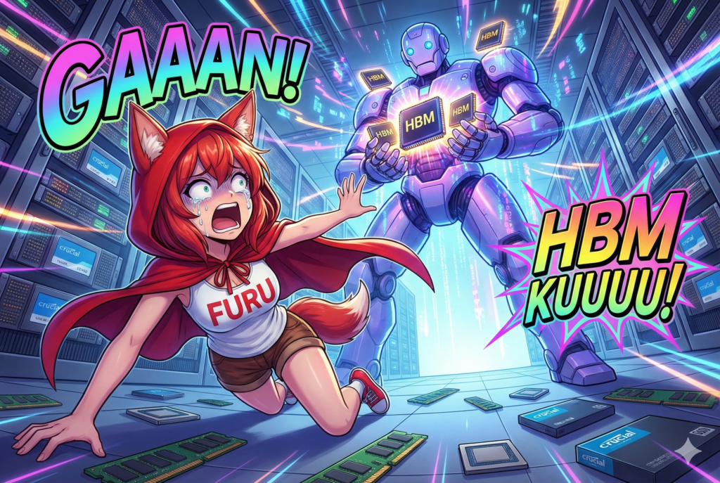 この潮目の変化を示す出来事として、半導体メーカーのMicronは2025年12月、消費者向けブランド「Crucial」事業からの撤退を発表しました。出荷は2026年2月頃まで継続し、保証やサポートは継続されますが、方向性としては、明らかに「AI・データセンター寄り」に、明確に方向転換してしまった、と言っても差し支えないでしょう。「Crucial」ブランドのSSD持っていたのに、ショックだわー。