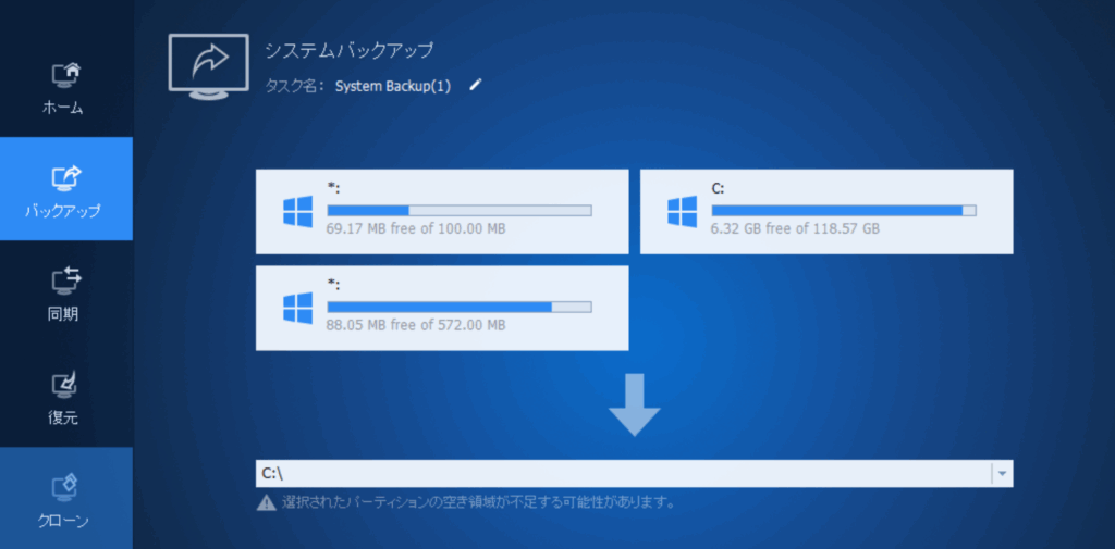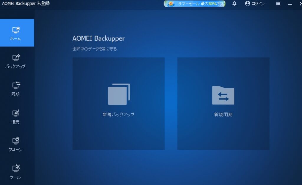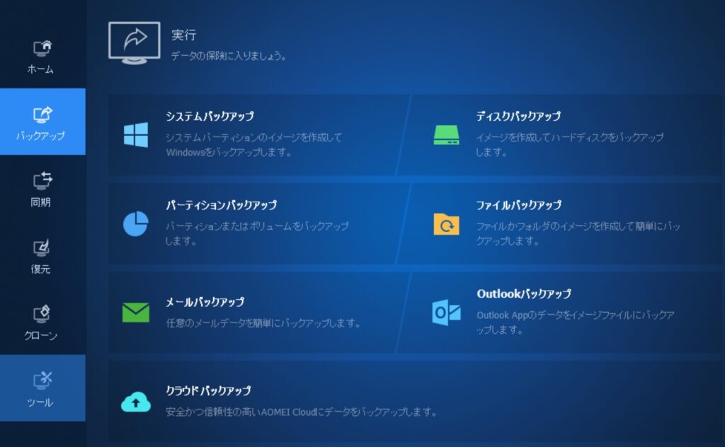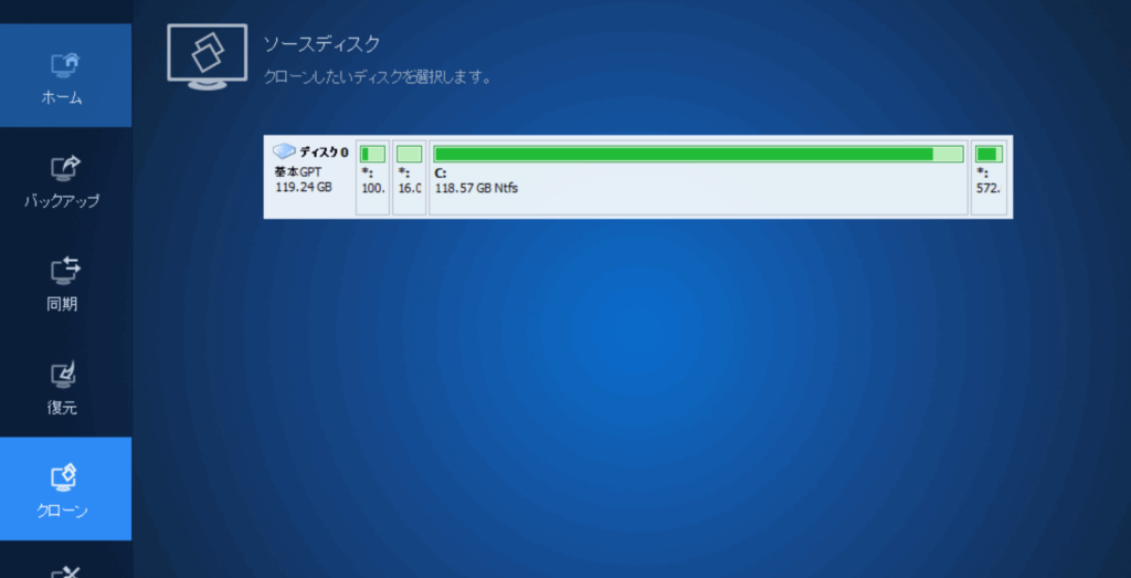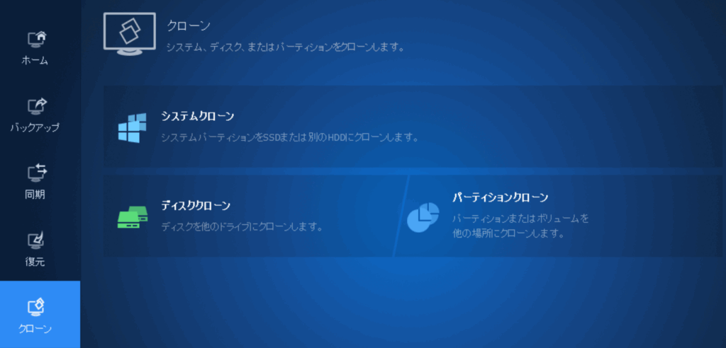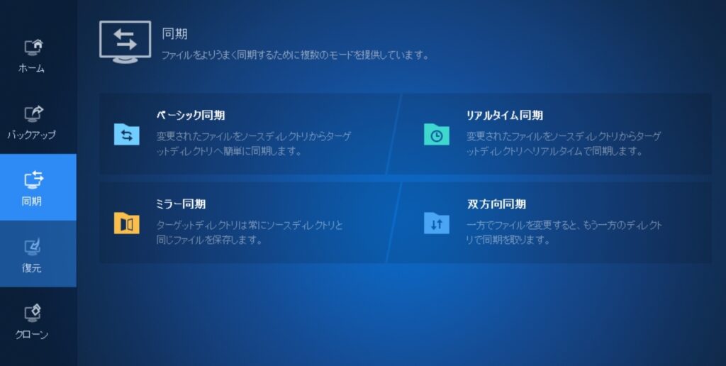 一番の印象は「画面がわかりやすい」ということです。メニューは「バックアップ」「復元」「クローン」「同期」とシンプルに分かれていて、それぞれウィザード形式で案内されるので迷うことがありません。