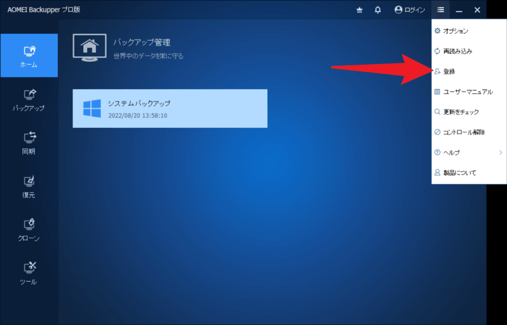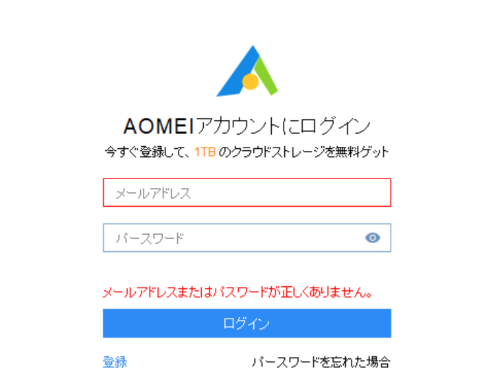 AOMEI Backupperのアプリ右上に「ログイン」と表示されている箇所をクリックすると、上の画面のようなログイン画面が出てきます。