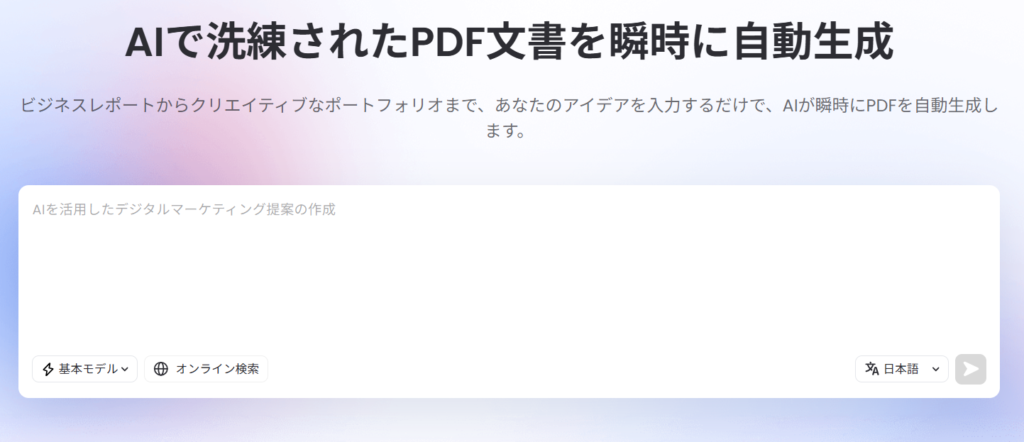 この機能も本当に便利でした。たった一言でもアイデアを出すだけで、AIが自動でPDF文書を作成してくれるんです。