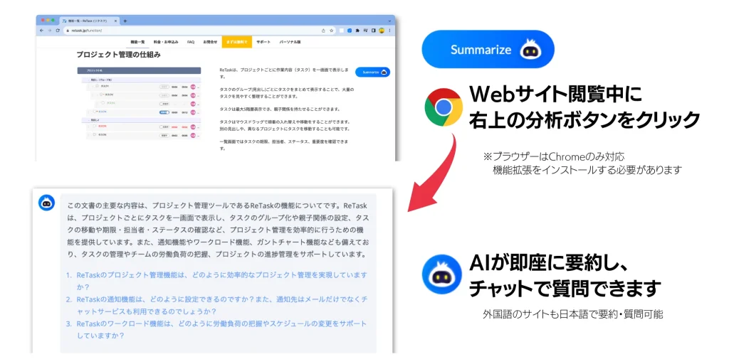 拡張機能を入れておけば、今見ているWebページをクリックひとつでAIが即座に解析して、要約したり、内容について質問できたりします。