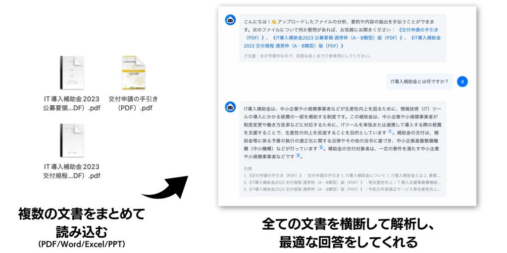 これらをまとめた上で、チャットで質問すると「全ファイルを参照しながら最適な回答」を導き出すという使い方が可能。