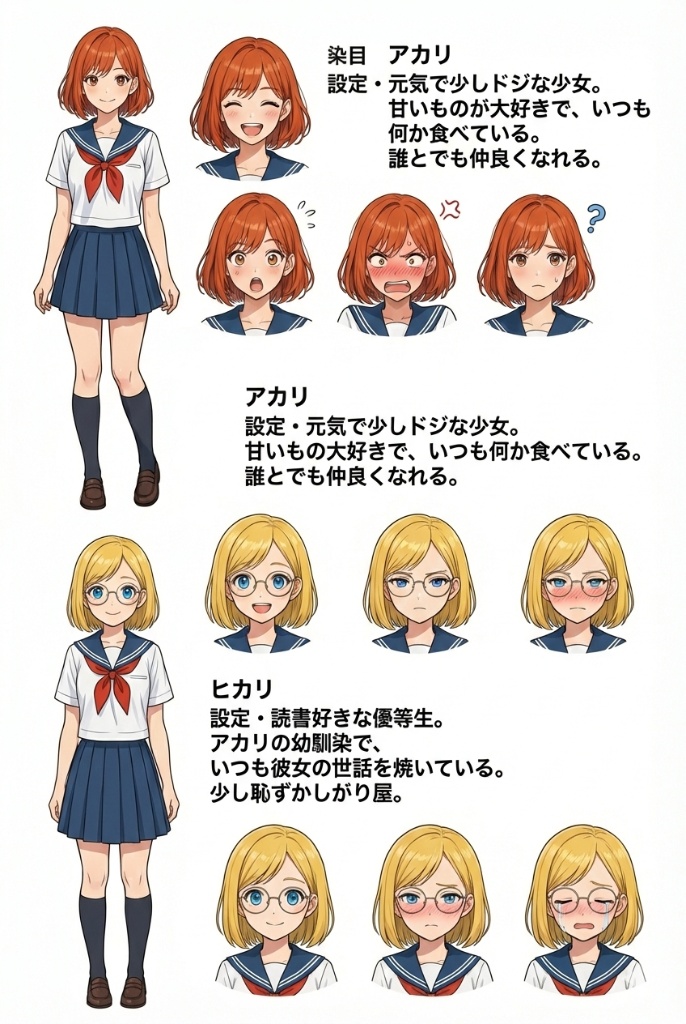 これを全コマのプロンプトに強制的に埋め込むことで、AIがどれだけ暴走しようとも、キャラクターの造形だけは「物理的に」固定される仕組みです。