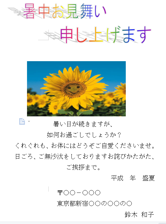 Wordではテンプレートを使用して暑中見舞いのはがきを作ってみました。